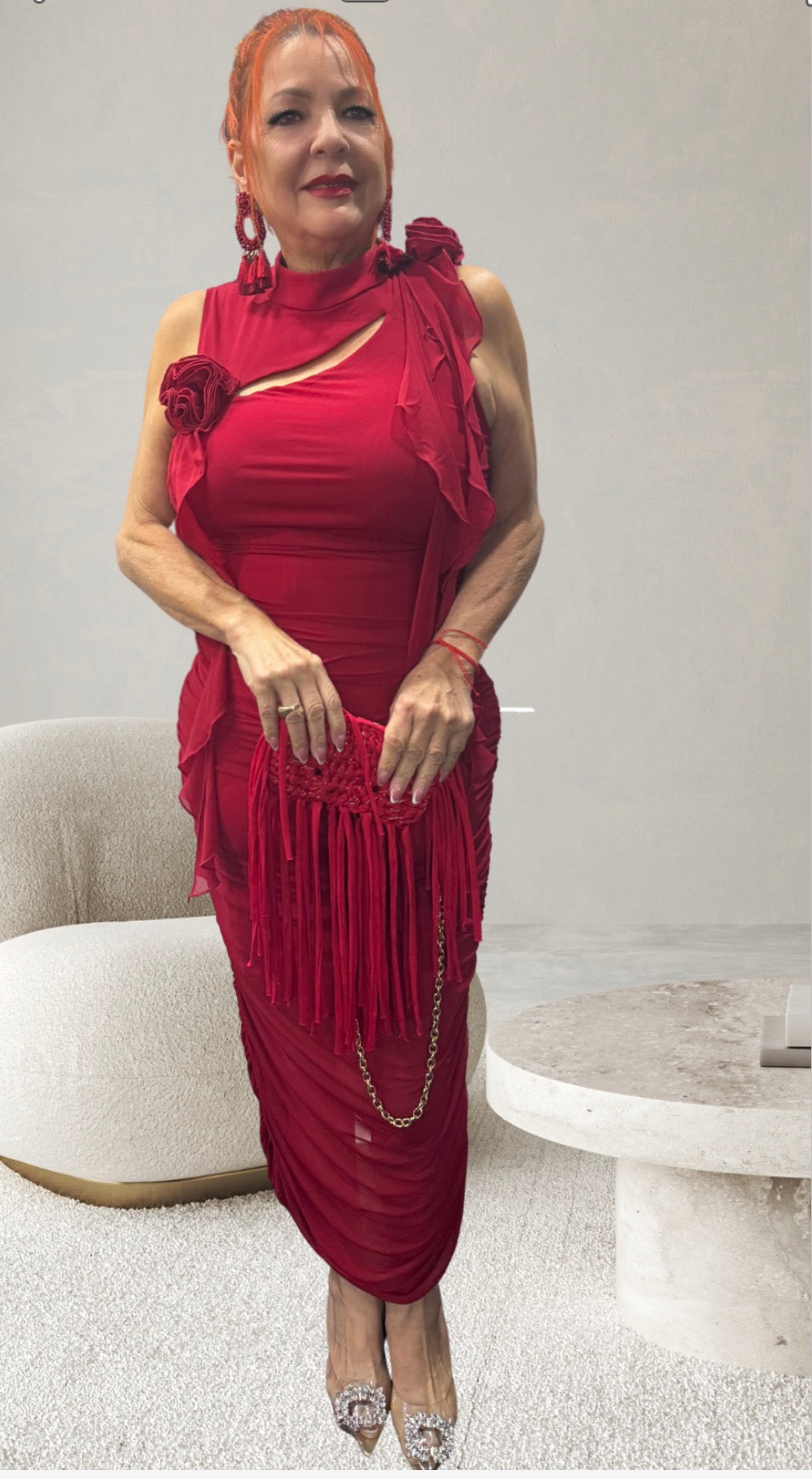 Traje midi color rojo, diseñado para robar miradas. Presenta una delicada abertura en el pecho adornada con flores, que aporta un toque femenino y sofisticado. La falda incorpora una sutil transparencia en la parte inferior, creando movimiento y sensualidad sin perder elegancia. Una pieza perfecta para eventos especiales, cenas o ocasiones donde quieras destacar con seguridad y estilo.